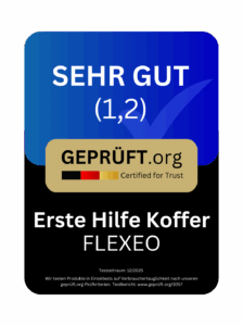 Der Erste-Hilfe-Koffer von FLEXEO wurde im Rahmen des standardisierten Prüfverfahrens von geprüft.org geprüft. Grundlage der Bewertung waren die formale Zulassungsprüfung (Stufe 0) sowie die praxisorientierten Teststufen gemäß Prüfer-Checkliste. Der Test erfolgte auf Basis der vorliegenden Produktunterlagen, der physischen Begutachtung und der dokumentierten Einzelkriterien. Das Produkt erfüllte alle formalen Voraussetzungen und wurde vollständig bewertet.