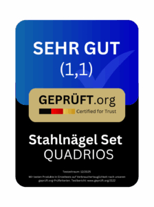 Das Stahlnägel Set von QUADRIOS wurde im Rahmen des standardisierten Prüfverfahrens von geprüft.org bewertet. Grundlage der Prüfung war die verbindliche Prüfer-Checkliste gemäß Produkttest-Testverfahren 2026. Der Test umfasste die formale Zulassungsprüfung (Stufe 0) sowie die praxisorientierten Bewertungsstufen 1 bis 6. Die Bewertung erfolgte ausschließlich auf Basis der vorliegenden Produktunterlagen, der physischen Begutachtung und der dokumentierten Einzelkriterien. Das Produkt erfüllte alle formalen Voraussetzungen und wurde vollständig geprüft.