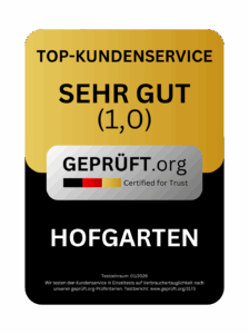 Der Kundenservice von HOFGARTEN wurde im Rahmen des standardisierten Prüfverfahrens „Top-Kundenservice“ von geprüft.org bewertet. Grundlage der Prüfung waren die verpflichtende Selbstauskunft des Unternehmens, deren stichprobenartige Verifikation sowie ein realer Mystery-Test mit einer konkreten Kundenanfrage. Ziel des Verfahrens ist die nachvollziehbare Bewertung der Erreichbarkeit, Reaktionsgeschwindigkeit, Kommunikationsqualität und Servicezuverlässigkeit.